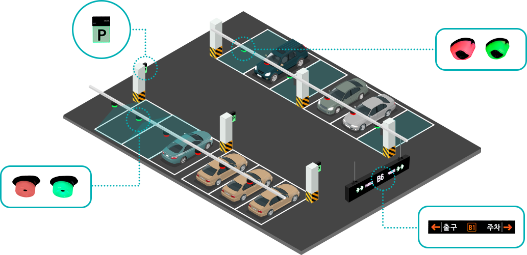 초음파 유도 관제 시스템은 각각의 주차면 중앙 또는 앞쪽 상부에 초음파 방식의 센서를 설치하여 차량의 주차 유/무를 표시하여 신속한 주차가 가능하도록 합니다. Point 01 주차관제 시스템별 구성 초음파센서 · 대각선형 초음파센서 · 수직형 공간표시등 구역제어기 층별안내판 입구종합안내판