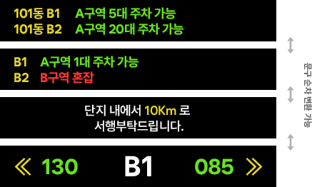 - 주차장 내에 전광판을 설치하여 실시간 주차 안내 가능(문구 순차 변환 가능).