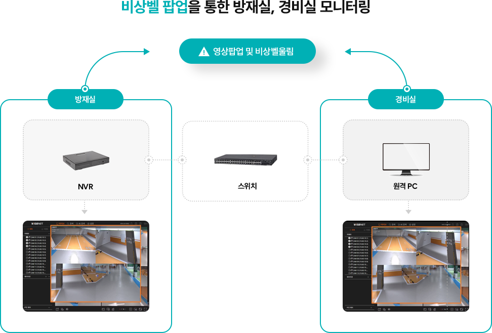 - 방재실 및 분산되어 있는 경비실과 동시에 상황 확인 가능.