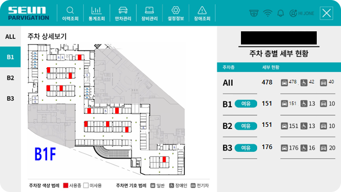 한눈에 주차면 타입별 주차현황을 확인할 수 있고 층별 주차 세부현황도 확인 가능.
